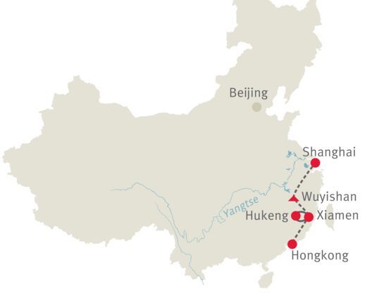 Fern der Glitzerwelt Shanghais stossen Sie in der Provinz Fujian auf überraschende Naturkulissen, berühmte Tee-Plantagen, ungewöhnliche Dörfer und koloniales Erbe, bevor Sie die Weltstadt Hong Kong erreichen.