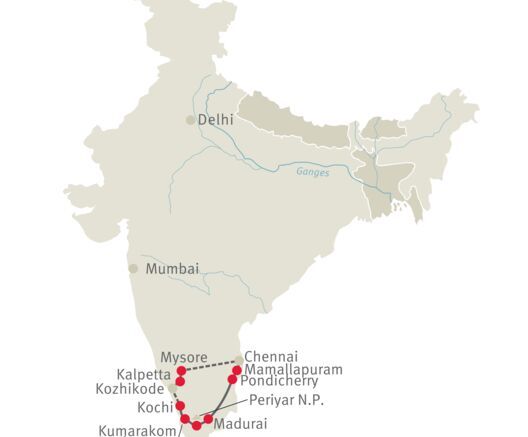 Entdecken Sie mit Gleichgesinnten in einer internationalen Gruppe die unterschiedlichen Facetten Südindiens von Küste zu Küste. Das Programm vereint das Beste aus Kultur und Natur und ist so gestaltet, dass Sie bestimmt auch mit Einheimischen ins Gespräch kommen.