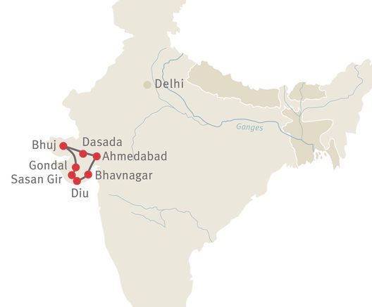 Gujarat, die Heimat Mahatma Gandhis! In kaum einem anderen Bundesstaat Indiens kontrastieren Vergangenheit und Gegenwart so stark. Nomadenstämme, die ihre Traditionen bis heute erhalten konnten, weite Landschaften, lebhafte Städte und Löwen im Nationalpark Sasan Gir – Gujarat bietet alles!