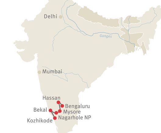 Südindien abseits der üblichen Routen! Vom «Silicon Valley Indiens» reisen Sie zu eindrücklichen Tempelruinen, in die Maharaja-Stadt Mysore und via Naturparadies Nagarhole Nationalpark zum weiten Strand von Bekal.