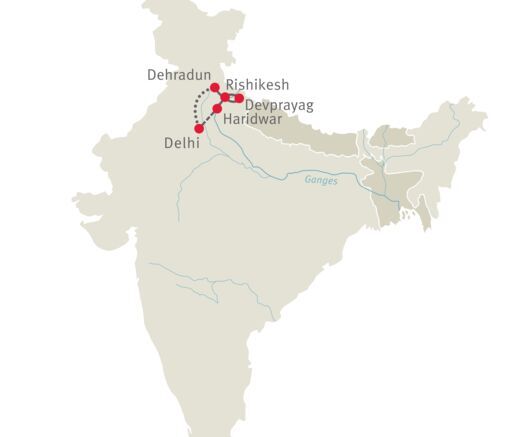 Auf Felsen schmiegt sich Rishikesh an den heiligen Ganges, im Hintergrund die mächtigen Gipfel des Himalayas. Ein magischer Ort erwartet Sie, Ausgangspunkt zahlreicher Pilgerrouten und geachtetes Zentrum von Meditation und Spiritualität!