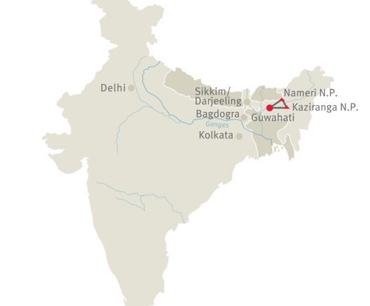 Der vom mächtigen Brahmaputra dominierte und für Tee-Anbau bekannte Gliedstaat Assam ist Heimat der Nationalparks Nameri und Kaziranga. Der Reichtum an Tier- und Pflanzenarten ist überwältigend und die urtümlichen Panzernashörner in freier Wildbahn zu beobachten ein unvergessliches Erlebnis.
