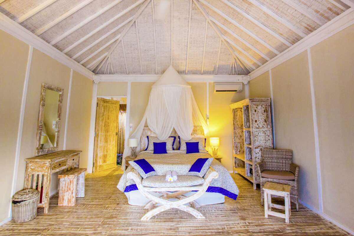Insegesamt 35 romantische Bungalows. Holz und Bambus sind die Hauptelemente, blau und weiss die Farben der liebevoll ausgesuchten Accessoires. Beach Bungalows in 2er Einheiten resp. alleinstehende Private Beach Bungalows. Sie bieten 30m² Platz, befinden sich in einer Reihe direkt am Strand und bieten eine wunderbare Aussicht auf das Meer. Wir empfehlen die neueren und grösseren Premium Beach Bungalows.
