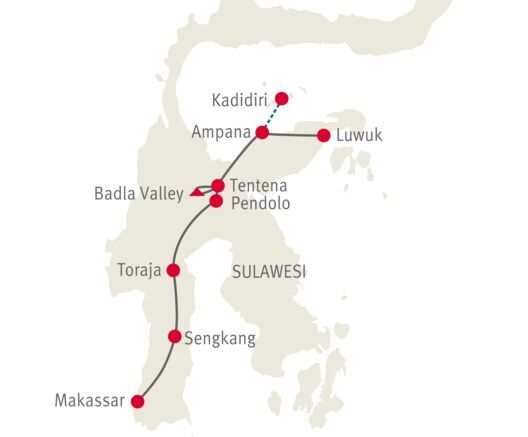 Eine eindrückliche Reise durch das kulturelle Herz Sulawesis. Majestätische Landschaften, ungewöhnliche, lebendige Traditionen und zum Schluss die magische Inselwelt der Togians. Herzliche Begegnungen unterwegs entschädigen für die einfache Infrastruktur. Ein Abenteuer weit abseits ausgetretener Pfade.