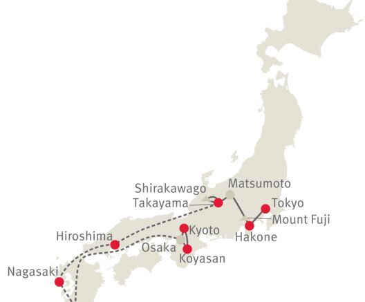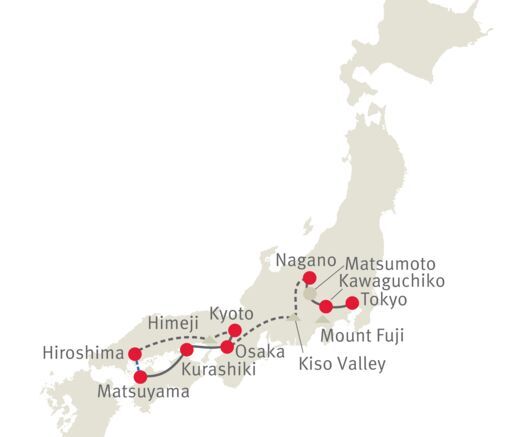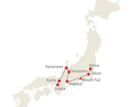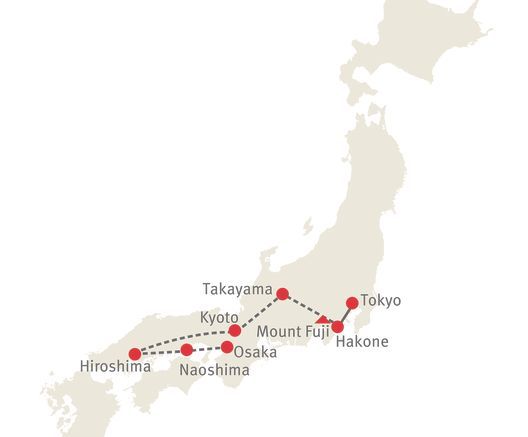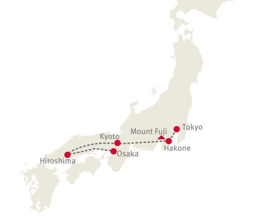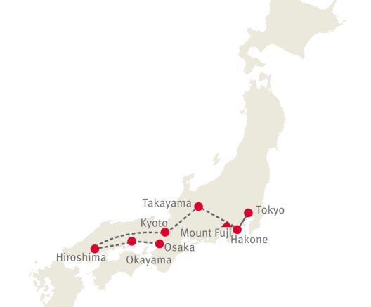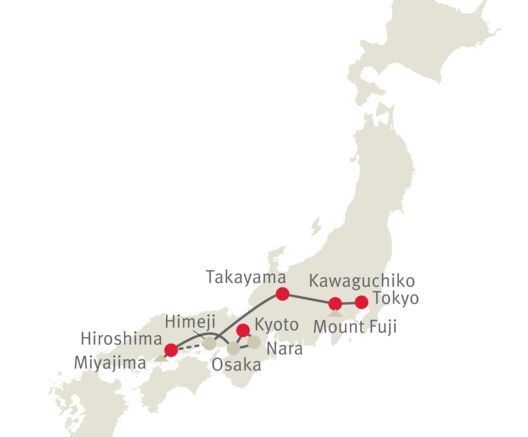 Auf dieser Reise erwartet Sie die immense Vielfalt eines der gegensätzlichsten Länder auf der Welt und die unverwechselbare Gastfreundschaft der Japaner. Von der Glitzermetropole Tokyo zum reizvollen Takayama, von der Kulturhauptstadt Kyoto zum geschichtsträchtigen Hiroshima und zur heiligen Insel Miyajima begeben Sie sich von Höhepunkt zu Höhepunkt.