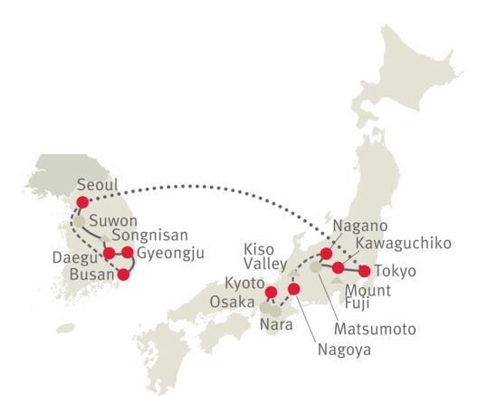 Erleben Sie die reizvolle Kombination zweier Länder, die ein harmonisches Miteinander von alter Kultur und westlichem Lebensstil bieten. Japan und Südkorea überraschen mit grandiosen Landschaften und Brauchtum. Trotz Gemeinsamkeiten bestehen viele Unterschiede, was spannende Eindrücke garantiert.