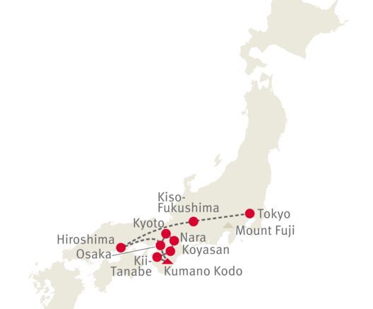 Mystisch, modern und malerisch – Japan ist ein Land mit vielen Facetten. Es sind diese spannenden Gegensätze, die Ihnen auf dieser Reise viel Abwechslung und unvergessliche Begegnungen bescheren; ob bei Mönchen in einem Tempel, unterwegs mit dem Fahrrad, im Zug oder auf Wanderungen.