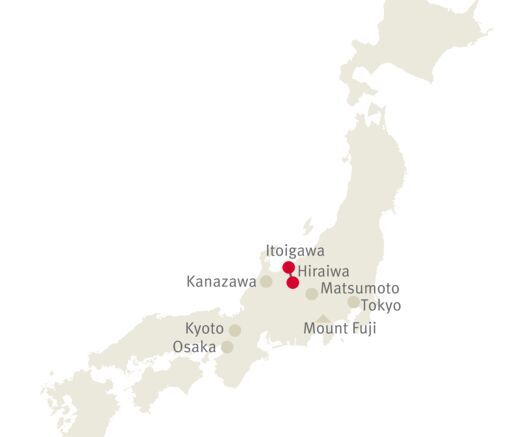 Die Region Itoigawa bietet auf engstem Raum ein Potpourri aus ganz unterschiedlichen Glanzlichtern. Geprägt vom weiten Meer auf der einen und den sich auftürmenden japanischen Alpen auf der anderen Seite, hat sich hier ein ländliches Japan erhalten, in dem Reisanbau und Fischerei nach wie vor eine grosse Rolle spielen.
