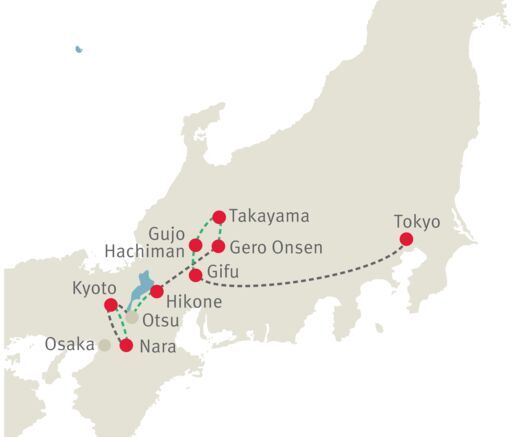 Entdecken Sie Japan auf unkonventionelle Art! Per Fahrrad folgen Sie alten Handelspfaden am Biwa-See und erleben ländliche Regionen in den japanischen Alpen, die einem sonst verborgen blieben. Ein unverfälschtes Stück Japan und hinreissender Gegenpol zu den Kulturschätzen Kyotos und dem geschäftigen Tokyo.
