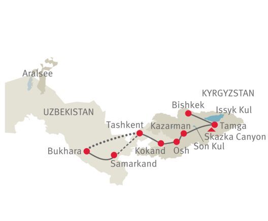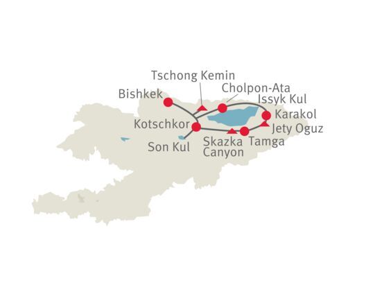 Versteckt im Herzen Zentralasiens liegt dieses unverbrauchte Juwel am Fuss des mächtigen Tien-Shan-Gebirges. Raue Landschaften von atemberaubender Schönheit prägen das Land. Wie seit Jahrhunderten ziehen im Frühjahr die Kirgisen mit ihren Schaf- und Pferdeherden auf die Hochweiden und stellen ihre Jurten auf. Hier werden alte Traditionen noch gepflegt. Die Lage an der Seidenstrasse machte Kirgistan zu einem Schauplatz einer langen und wechselvollen Geschichte. Unzählige Karawanen zogen durch das Land und leisteten ihren Beitrag zu einem lebhaften Kulturaustausch. Freuen Sie sich auf architektonische Kleinode, geschäftige Basare, schroffe Gipfel und Bergseen und nicht zuletzt auf die legendäre Gastfreundschaft der Menschen.
