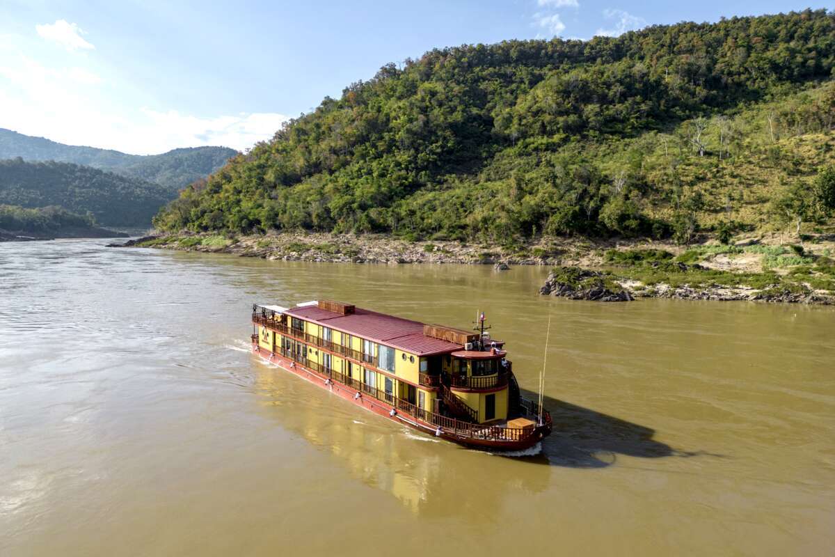Frühmorgens Grenzübertritt nach Laos, wo Sie an Bord des Boutique Schiffes Anouvong begrüsst werden. Nach dem Ablegen gleitet das elegante Schiff gemächlich flussabwärts durch die bezaubernde Landschaft. Unterwegs wohnen Sie in einem Dorf der Khamu-Minorität einer Segnungs-Zeremonie bei.