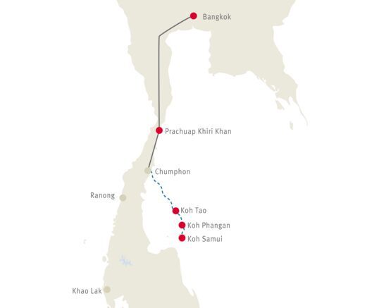 Traumhafte Sandstrände, türkisfarbenes Meerwasser und eine intakte Unterwasserwelt lassen Inselträume wahr werden. Eine Reise vom lebendigen Bangkok über den Isthmus von Kra nach Koh Tao und Koh Phangan.