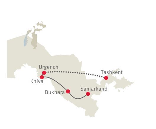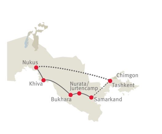 Mit wertvollen Schätzen beladene Karawanen durchquerten über Jahrhunderte Usbekistans Wüsten. In einer Kleingruppe folgen Sie den alten Handelsrouten, deren blühenden Oasenstädte mit ihren prachtvollen Monumenten Sie auch heute noch in Staunen versetzen werden.
