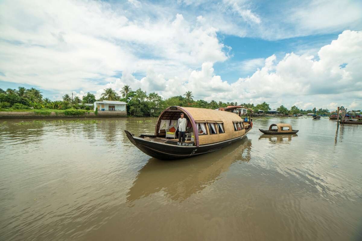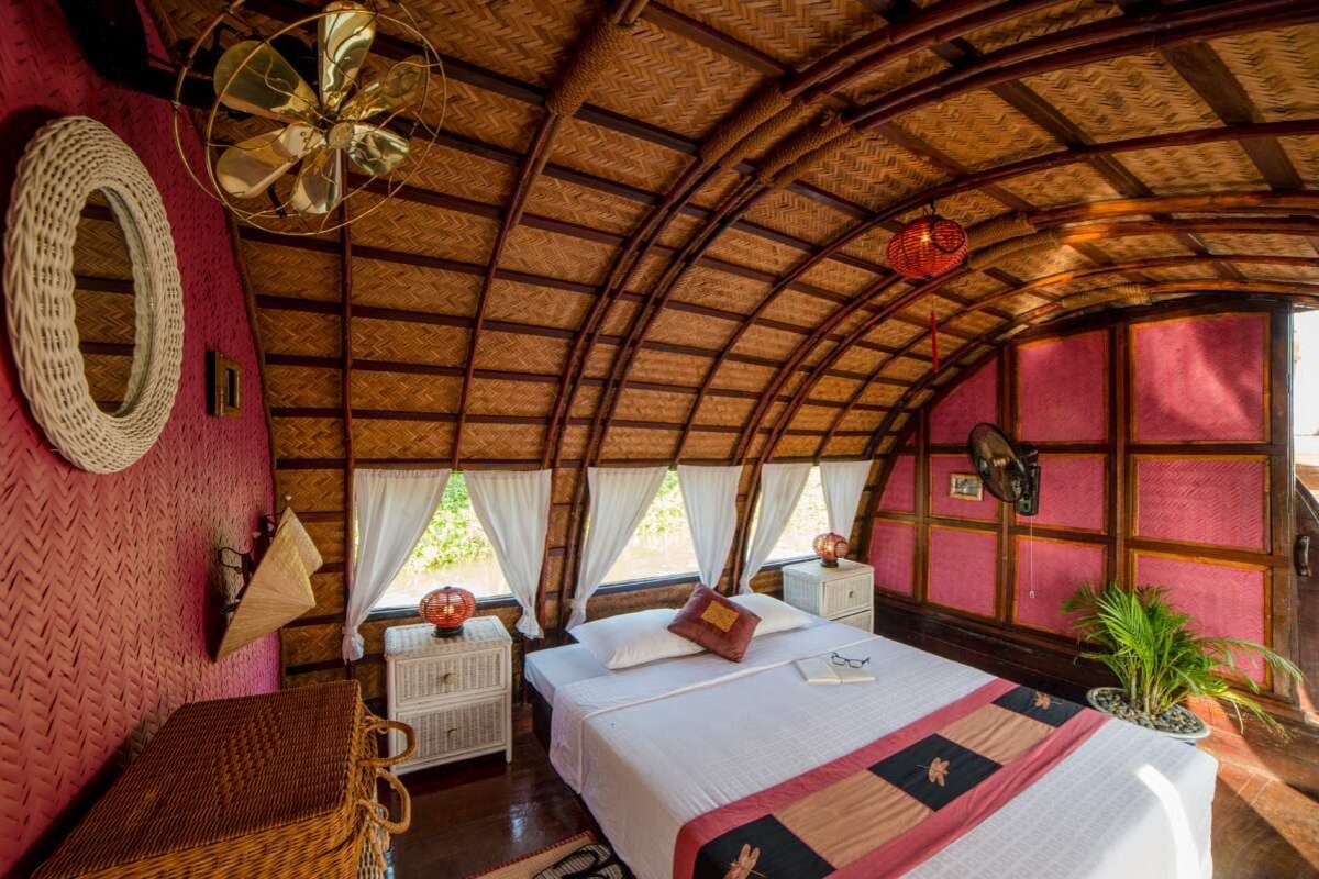 Das komfortable Hausboot im traditionellen Stil steht Ihnen exklusiv zur Verfügung und bietet zwei jeweils 15 m²grosse Kabinen, die mit einem Ventilator ausgestattet sind. Das Boot verfügt über ein Badezimmer und einen gedeckten Salon mit bequemen Sitzgelegenheiten, von denen aus Sie die Aussicht geniessen können. Ein kleines Beiboot «Xuong» und Fahrräder für Exkursionen werden ebenfalls an Bord mitgeführt.